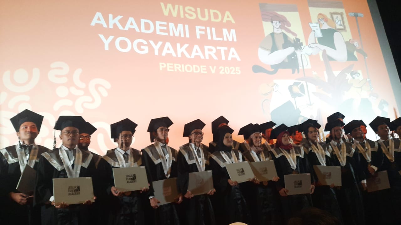 Tidak seperti wisuda pada umumnya yang digelar di aula atau gedung kampus, Akademi Film Yogyakarta memilih tempat yang “anti-mainstream” — di bioskop tempat karya-karya mereka benar-benar hidup di layar lebar untuk acara wisuda periode V 2025. Sebuah pilihan simbolis yang seolah berkata: “Inilah panggung kami, tempat kami berbicara lewat gambar dan cahaya.”